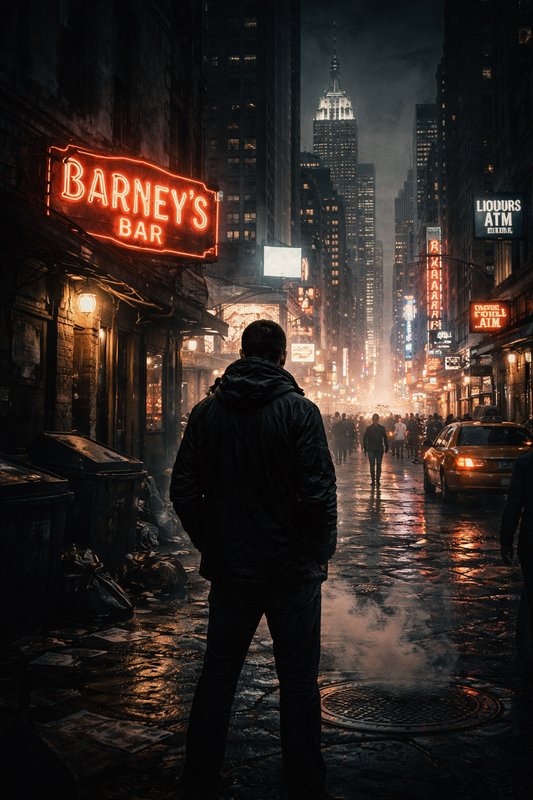 Бар «У Барни» я нашел совершенно случайно, когда просто бродил по кварталу в поисках тишины. Тусклая вывеска с мигающей неоновой буквой, засиженная мухами витрина, заляпанная отпечатками рук многих поколений неудачников – место выглядело именно так, как нужно. Внутри пахло правильно: застарелым деревом, дешевым пивом, хлоркой и тем специфическим металлическим ароматом, который бывает только там, где много пьют и редко извиняются. Такие заведения не задают лишних вопросов, потому что их владельцы сами не горят желанием слушать правдивые ответы.