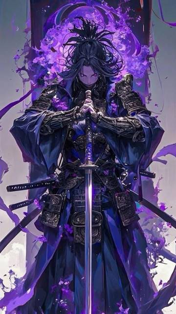 Выглядел он как высокий молодой мужчина с хвостом черных коротких волос, прямыми и резкими чертами лица и горящими лиловыми глазами. Одет он был в традиционное пурпурное кимоно, поверх которого был облачен в старинный самурайские доспехи, а за его спиной платиновая блондинка увидела сразу несколько катан, сложенных в неаккуратную стопку.