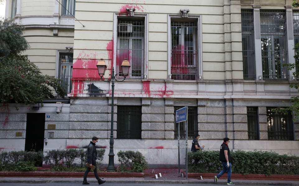 Заляпанное краской посольство. Первый день буйства. Толпа пока небольшая и её вытеснила полиция.