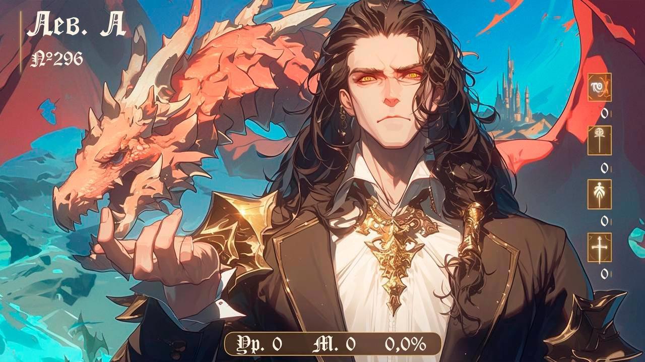 Первое, что меня поразило – я был на заставке не один. Позади меня красовался дракон, алый и свирепый. Дальше я офигел от своей вполне пижонской одежды, вовсе не оборванца рыцаря, а какого-то богатого господина. Интересно, конечно. Ну и справа и снизу были строки, интересовавшие меня в первую очередь.
