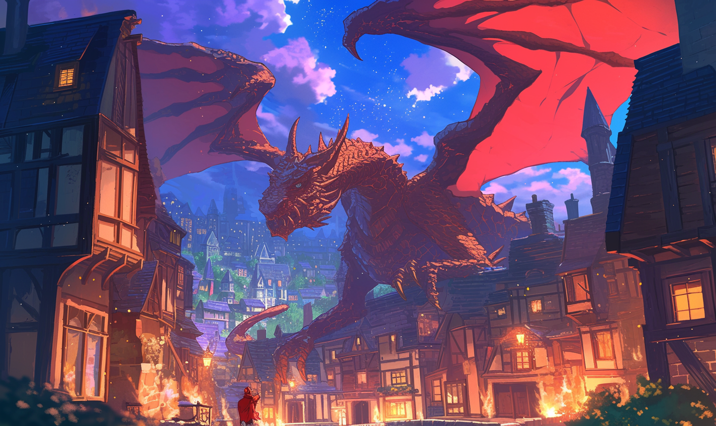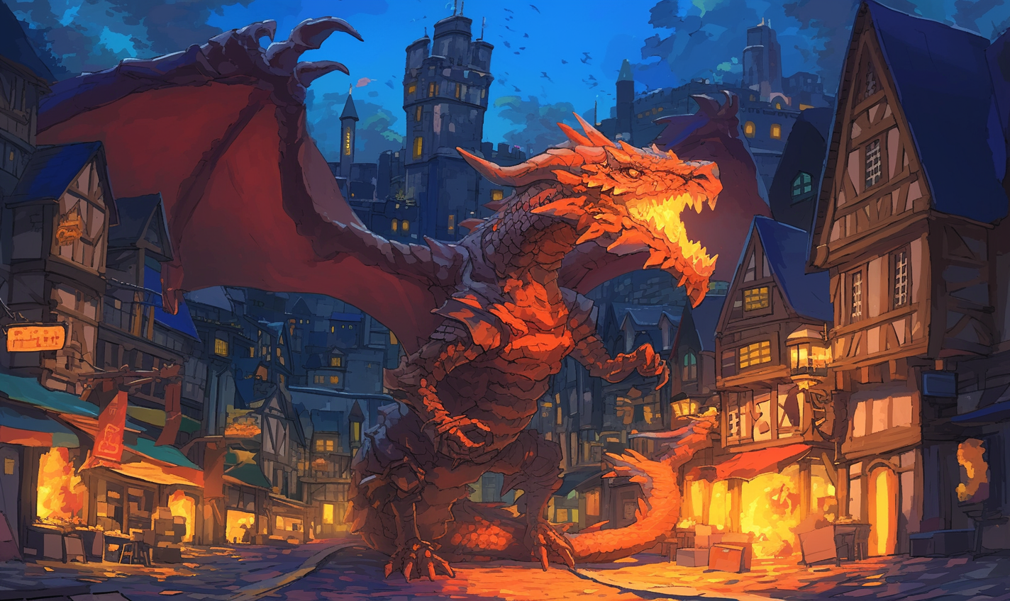 Однако, нам не только не удалось спрятаться, не вышло даже сбежать нормально. Алый дракон взмахнул крыльями, уже через секунду многотонной тушей падая перед нами. Хвостом эта тварь сшибла часть чьей-то лавки, но меня пока больше волновала моя судьба. Толкнув мужичка в бок, я рванул прочь в переулок. Ящерица, конечно же, погналась за движущимся объектом, то есть за мной. Хотя зеленый дракон остался на месте, это была маленькая победа.