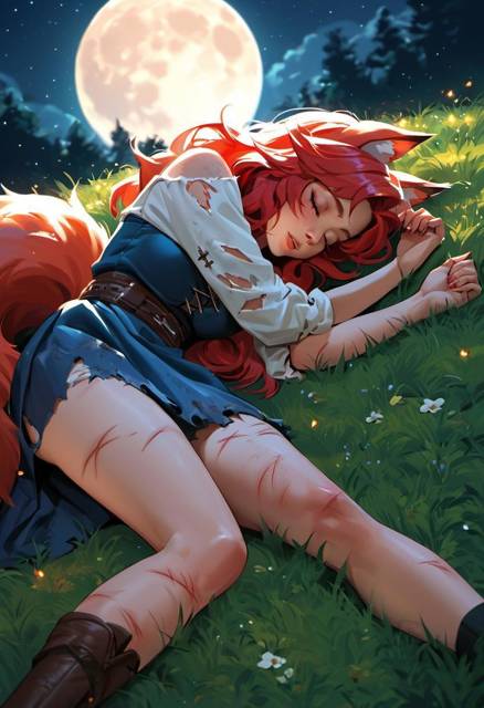 Резко подняв ветви куста, я вдруг чуть не шандарахнул заклинанием по свернувшемуся клубочку рыжевато-жёлтой шерсти. Ох… Там лежала зверолюдка-лиса, поджав под себя ножки и держась за рану на боку. Она смотрела на меня из-под опущенных ресниц, пытаясь скалить зубы, но только тихо хныкая от боли.