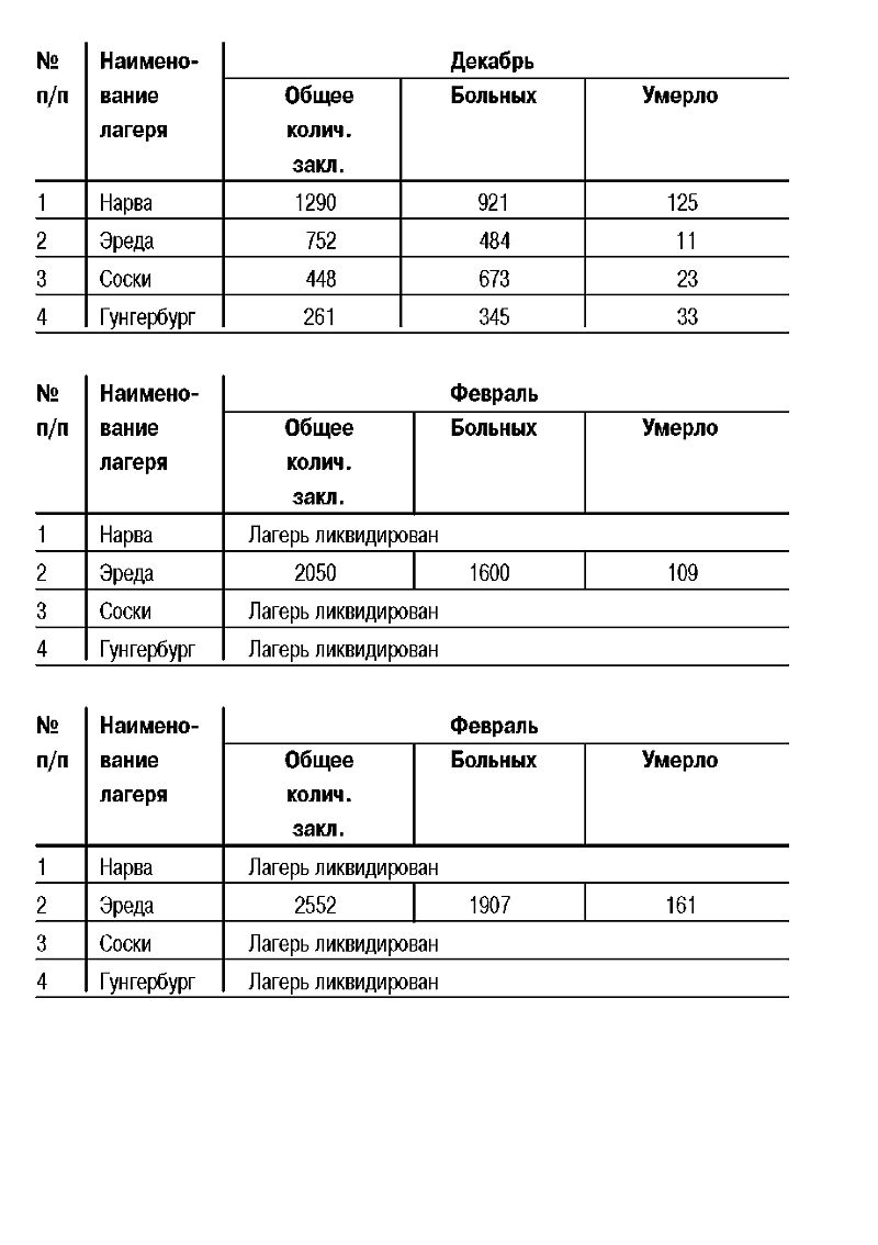 По отдельным лагерям заболеваемость и смертность заключенных в конце 1943-го и начале 1944 г. характеризуется следующей таблицей (по отчетам главврача БОДМАНА):
