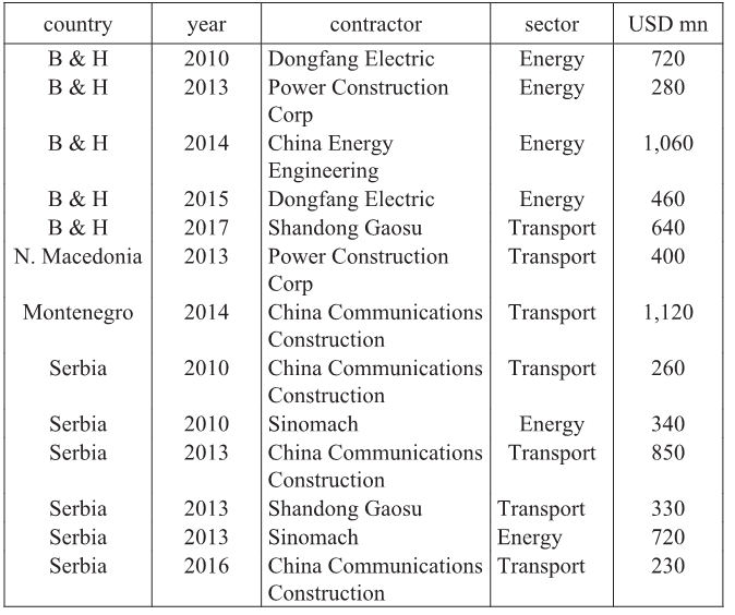Table 2: Chinese firms’ major construction contracts in the Western Balkans, 2010–2017 [Holzner, Schwarzhappel, 2018. P. 17]
