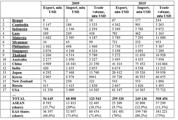 Increased investment from both ASEAN and EAS members in Vietnam’s economy deserves mentioning. While in 2009 the USA ($9.8 billion), Cayman Islands ($2.2 billion) and Samoa ($1.7 billion) were leaders in terms of registered FDI, ten years later the list of major investors looked like this: the Republic of Korea ($7.9 billion), Hong Kong ($7.9 billion), Singapore ($4.5 billion), Japan ($4.1 billion), China ($ 4.1 billion)5454