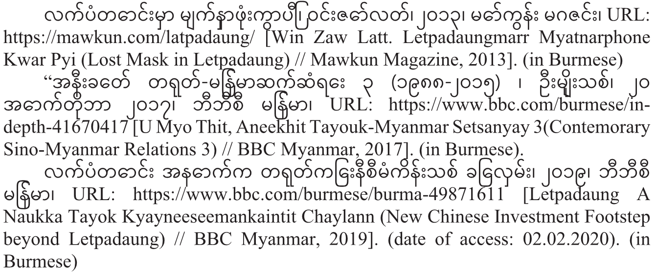 Maung Aung MYOE, Myanmar’s China Policy since 2011: Determinants and Directions // Int. J. Journal of Current Southeast Asian Affairs, 2015, Vol. 34. No. 2. Pp. 21-54. URL: https://journals.sub.uni-hamburg.de/giga/jsaa/article/view/872/879. Html (date of access: 05.01.2020). (in English)