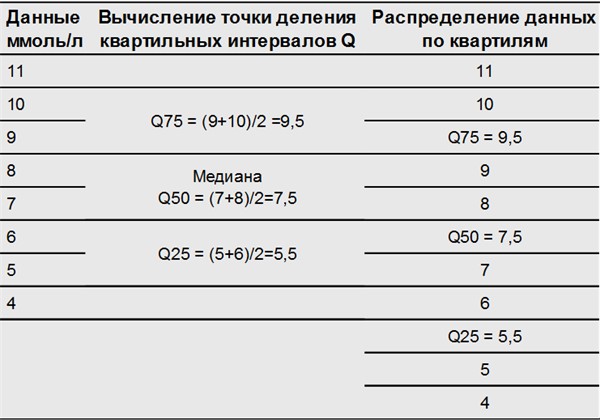 Таблица 1.7.4.1. Пример расчета медианы и квартильных интервалов в ряду из 8 показателей гликемии