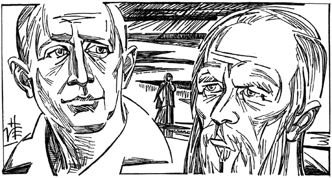 Тактично соблюдая некоторую разумную дистанцию, спешу заметить, что рисунки (портреты и заставки), оформляющие альманах «Истоки», отражают неслучившийся в земной жизни диспут Достоевского и Бунина. Их близкое соседство и художественное различие почтительно объединяет графика.