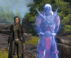 – И кого ты сюда привёл? – донёсся строгий голос. Призрак Силы? Рядом с голопроектором находился высокий мужчина в одежде, что сочетала алый и чёрные цвета. На его голову был надвинут капюшон, а маска скрывала его лицо.