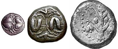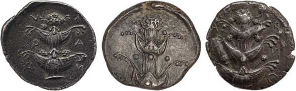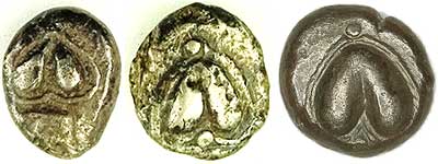 Рис. 47. Ориентация семян сильфия на серебряных драхме, дидрахме и тетрадрахме Кирены VI-V вв. до н.э.