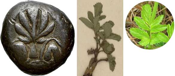 Рис. 36. Изображение листа сильфия на тетрадрахме Кирены V в. до н.э. Рядом для сравнения листья прикорневой розетки дягиля короткостебельного и дудника толстоплодного[35]35