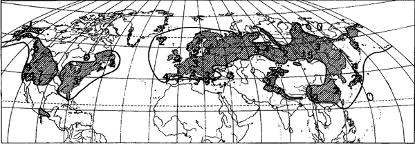Рис. 40. Общее распространение Angelica L., включая Archangelica Hoffm. и Ostericum Hoffm. (Weinert, 1973).