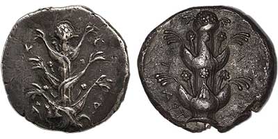 Рис. 43. Разные типы ветвления стеблей сильфия на тетрадрахмах Кирены 435-375 гг. до н.э.