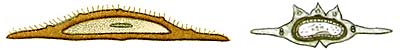 Рис. 50. Поперечный срез полуплодиков ферулы вонючей (Ferula assa-foetida) (слева) и дягиля лекарственного (Archangelica officinalis) (справа) (иллюстрации из Köhler, 1890 и Цицин, 1962).