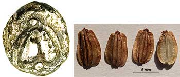 Рис. 49. Слева – семена сильфия на драхме Кирены, справа – прикрепление мерикарпия дягиля лекарственного к карпофору в действительности и ошибочное на ботанической иллюстрации (иллюстрация из Thomé, 1885).