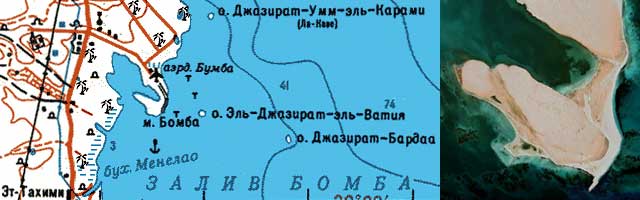 Рис. 3. Не совсем остров Бомба на топокарте масштаба 1:500000 и снимке из космоса.