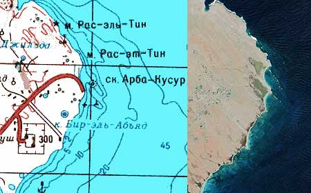 Рис. 8. Мыс Рас-эт-Тин на топокарте масштаба 1:250000 и космоснимке.