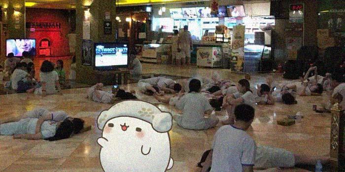 А тут многолюдно! Кто-то смотрит телевизор, некоторые общаются. Самое удивительное, что все устроились на полу… Так и лежат, небольшими группками.