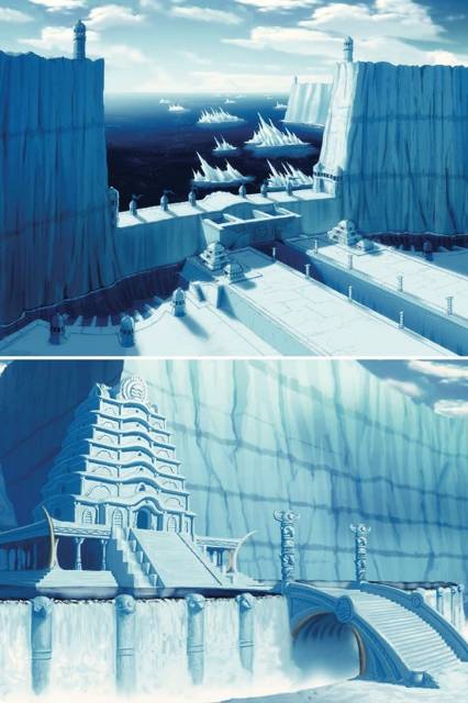 В глаза сразу бросается огромная ледяная стена, окружающая наше поселение и защищающая от атак Народа Огня. Чтобы попасть к нам необходимо пройти через серию шлюзов, контролируемых магами воды. Они поднимают и опускают уровень воды, позволяя входить суднам или напротив, блокируя захватчикам путь к наступлению.