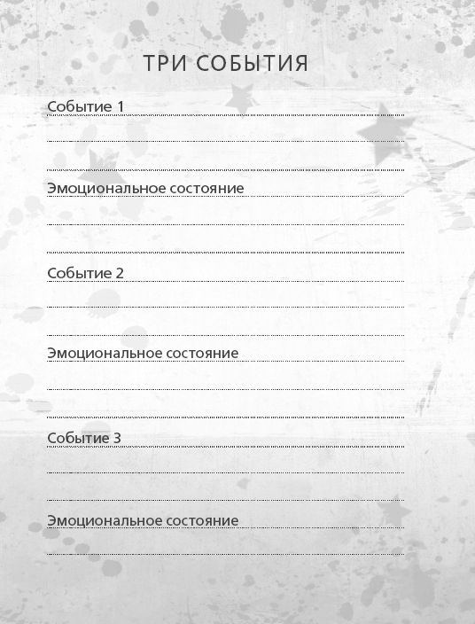А теперь, когда вы вписали все три события, посмотрите на них глазами человека, принимающего на себя ответственность за собственную жизнь. Внимание: не виноватого в своих бедах, а именно ОТВЕТСТВЕННОГО за все, что произошло. То есть, глядя на эти происшествия, вспомните, какое эмоциональное состояние, какое настроение предшествовало каждому из них на протяжении нескольких дней, месяцев, а то и лет. Возможно, это была неконтролируемая тревога, постоянное пережевывание старых обид, вы испытывали чувство вины, зависть, желание отомстить… Запишите это на следующем бланке. Например: