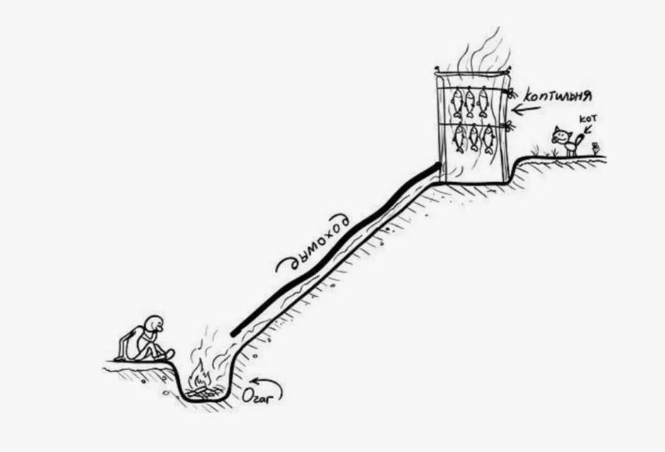 Теперь коптильня готова. Дым от тлеющих в малом очаге влажных веток ивы уже шёл по каменному туннелю, остывал в нём до 25–30 градусов, а затем собирался в коптильной камере.