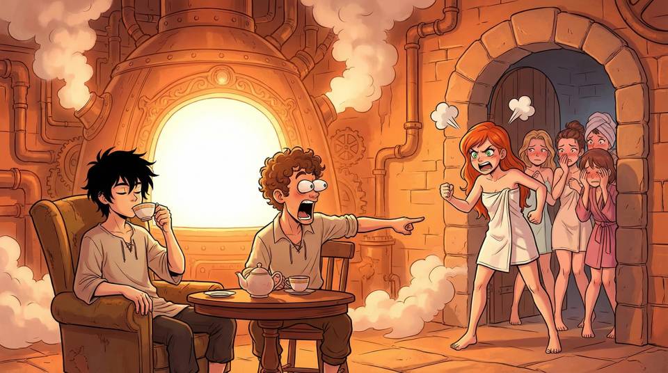 Паника охватила всю купальню. Девушки вскакивали со скамей, хватаясь за полотенца, спотыкаясь друг о друга в клубах раскалённого пара. Кто-то кричал, кто-то звал на помощь, кто-то просто метался, не понимая, куда бежать.