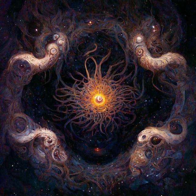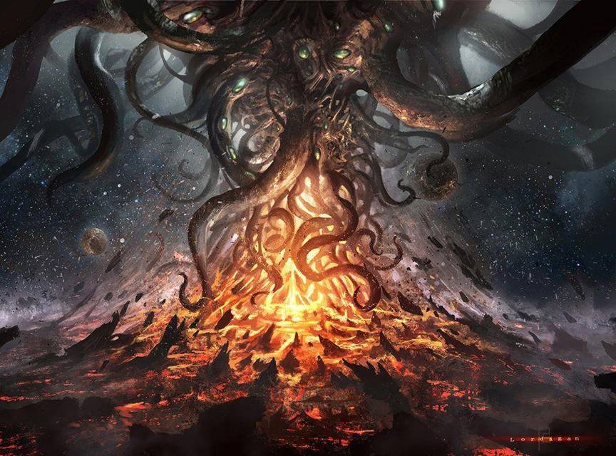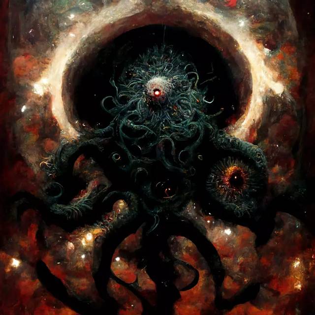Азатот: бурлящая масса разрушительной и преобразующей силы, интенсивная форма существования, чистое бытие, не ограниченное формой или реакцией; но это существование принадлежит к типу, отличному от того, к которому мы привыкли, и поэтому представляется как небытие, потому что оно не соответствует ни одному из требований, которые, на наш взгляд, определяют существование., обитающая во тьме между звездами, глубоко в центре вселенной. Там, замаскированный завесой кружащегося цвета от взглядов смертных, он окружен другими Внешними Богами, составляющими его двор, бесконечно танцующими и скачущими вокруг него, наполняя пустоту звуками ужасных флейт, чтобы не разбудить его, день пробуждения Азатота вернет мир к его изначальному состоянию абсолютного нуля, изначальному хаосу. Он совершенно безразличен к тем немногим, кто почитает его и не знает о них. Именно эта слепая, безразличная натура делает Азатота идеальным воплощением слепой, безразличной вселенной.
