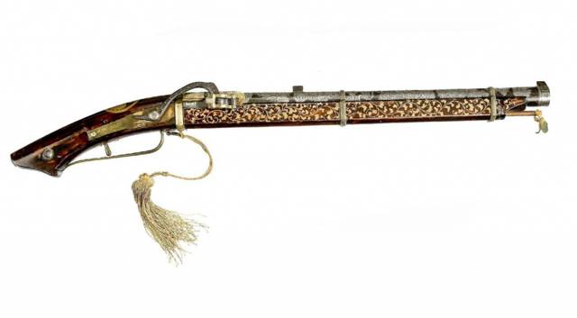 Здесь же… Поверхность на всём протяжении ствола, в казённой, средней и дульной частях, граненая, с наличествующей мушкой и специальной пороховой полкой с поворотной крышкой. Вся поверхность ствола украшена насечкой с изображением дракона, изрыгающего пламя. Ствол присоединен к ложу двумя шпильками, проходящими через боковые отверстия ложи и петли ствола, сделанные из желтого, похожего на золото материала, как и другие части, кроме самого ствола: фитильный замок, округлый спусковой крючок. Также ствол и ложе дополнительно укреплены золотистыми кольцами-хомутиками. Сложный анатомический приклад из красного, с прожилками, дерева – тоже украшенный, только уже тонкой серебряной проволокой. Шомпол металлический с постепенным утолщением к дульному срезу вставлен в паз ложа. Неизвестные мне руны нанесены на ложе под стволом, на нижних гранях ствола и на нижней стороне крышки пороховой полки, на обеих сторонах замочной доски, на спусковом крючке, на ложевом кольце.