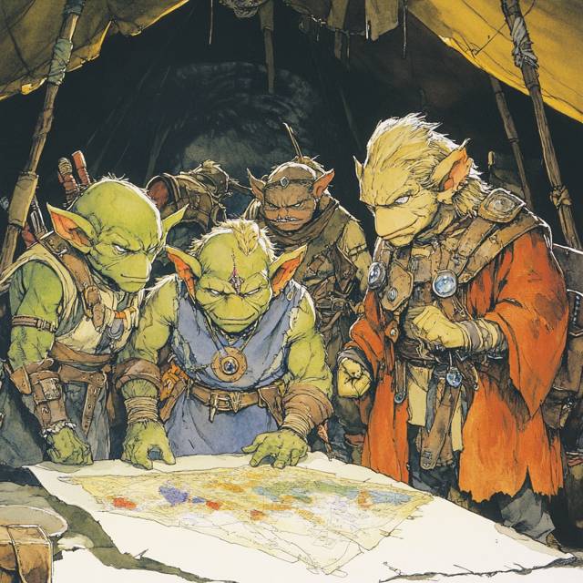 В огромной палатке расположился военный совет высших гоблинов. Крупные зелёные существа, одетые в шкуры животных, склонились над картой, что-то бурно обсуждая. Посередине стоял гоблин, выделявшийся особо мощным телосложением, и одетый в более красивую шкуру, и на шее его висело ожерелье из каких-то разноцветных полупрозрачных камней.