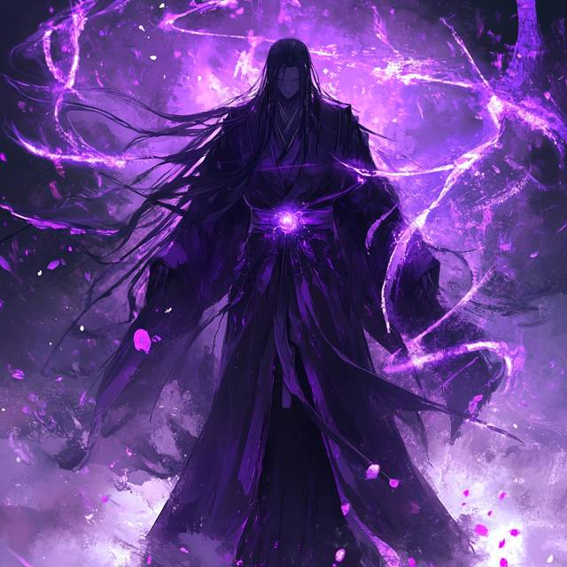 Внезапно в пространстве ощутились мощные колебания духовной энергии, так что стоящие в зале люди стали балансировать на ногах, чтобы не упасть под колоссальным давлением. На месте трона со вспышками ярких светящихся линий появилась фигура высокого человека в фиолетовых одеждах. Его длинные фиолетовые волосы спускались по плечам, на лице виднелась небольшая бородка, а глаза светились фиолетовым светом.