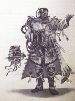 Дорога до заказчика заняла пару часов, но в результате мы достигли гигантского здания, лишённого какого-либо изящества. Это была серая коробка, на которой даже типичных Имперских черепов и птиц не было. Честно говоря, оно выделялось тем, что в нём не было ничего выделяющегося. Мы зашли внутрь, всё ещё в окружении Чёрных Храмовников, и сразу же встретили, вероятного, нанимателя Астартес. Перед нами стоял очень интересный мужчина. Статный человек с короткой причёской и со смуглой кожей, он носил парадную военную одежду. Стоит признать, она действительно подходила ему, ибо значительно усиливала его ауру силы и власти. Особенно выделялась какая-то аугментация у его виска, из которой выходил провод, к его спине. Без понятия, что это такое, ибо даже у техножрецов не видел подобного.
