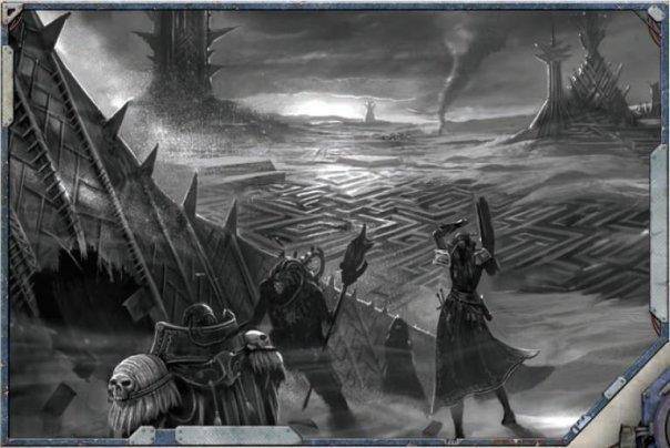 Поверхность Комуса была очень интересной и буквально каждый элемент привлекал моё внимание. Во-первых, конечно, смущали странные огромные ураганы вдалеке, которые были переполнены психической мощью. Но они не двигались в нашу сторону и, в теории, я был в состоянии их остановить, хотя это и потребовало бы огромных усилий с нашей стороны. Затем мне были любопытны странные строения, являвшиеся монументальными конструктами вроде пирамид и монолитов, каждый из которых высотой больше километра и шириной в несколько сотен метров. Они состояли из какой-то серой кости, буквально светившейся в варпе. Ну и к тому же каждый из них был украшен разноцветными кристаллами, похожие на те, что были у кораблей ксеносов. Опять же, переполненными психической энергией. И, наконец, вдалеке находился чёрный лабиринт из неизвестного мне материала и самое необычное в этом нём было то, что я не мог абсолютно никак его почувствовать. Вообще. В варпе это было самое обычное место, хотя, очевидно, странный лабиринт на проклятой планете ксеносов не мог быть обычным по определению. Особенно, если всё здесь прямо фонит психической энергией. Всё, кроме этого места. Это не было похоже на способности парии, нет, просто казалось, словно я смотрю в тёмный колодец, у которого нет дна. И было неизвестно, что или кто может ждать в этой тьме.