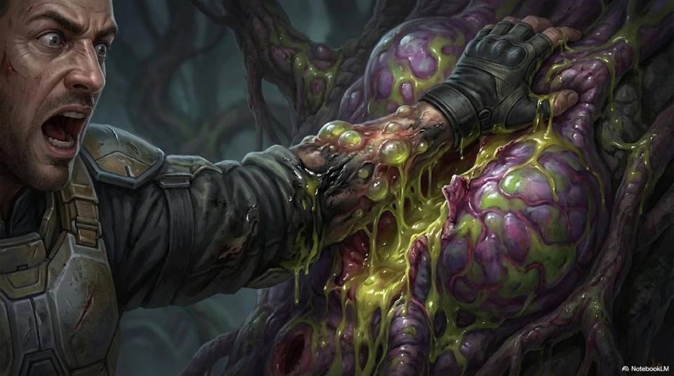 – ААА! – Сзади донесся вой боли, и обернувшись, я увидел Богдана, покоцанного после того, как тварь его чуть не добила. Но сейчас он как-то оказался на корне, а его правая рука утонула в разорвавшемся наросте, уйдя куда-то глубоко внутрь корня. Через секунду парень уже скатился вниз, на нашу сторону, бешено вскочив. Но облепившая его конечность слизь все еще шипела, явно доставляя парню чудовищные муки.