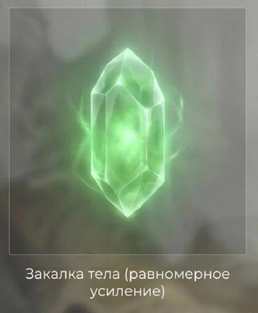 «Закалка тела» (качество: низкое) (Тип: универсальное усиление) – Тело идущего, что примет этот дар станет намного крепче и сильнее.