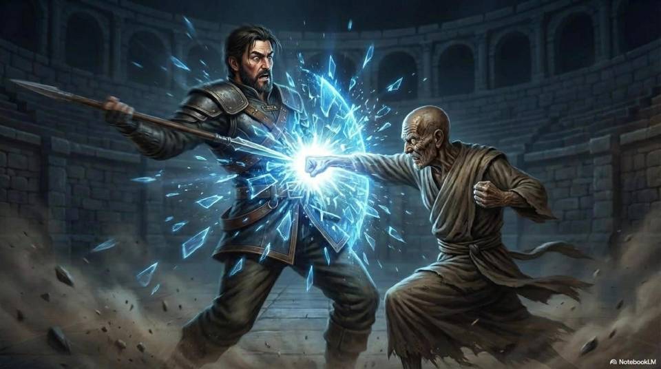 Через пелену в глазах я лишь увидел, как дед пластичным движением отклоняет корпус в сторону, пропуская острие мимо, а потом хватает древко и кидает себя вперед с умопомрачительной скоростью.