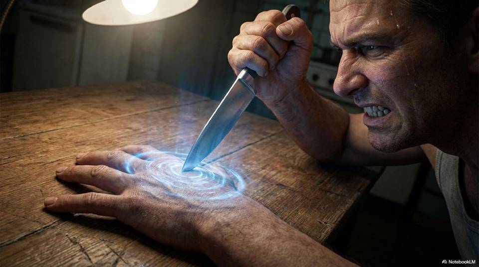 – Смотри! – Прошипел я, беря нож и кладя левую руку на стол, а потом вонзая острие сверху. Нелл не стала верещать или отговаривать меня. И клинок остановился в миллиметре, увязнув в синем мерцании. Однако я ощутил, что сейчас техника работает слабее. Да и пришлось ее тут же отключить, чтобы прямо тут не потерять сознание.