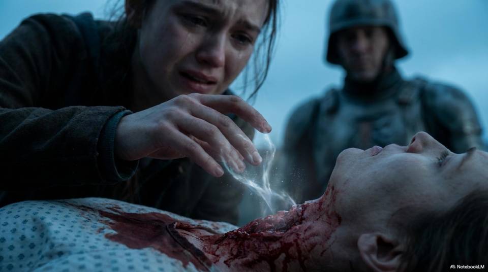 Откуда-то подбежала девчонка, бросив арбалет и падая на колени рядом с телом. Ей явно было страшно. Но несмотря на это, она что-то начала делать, прикладывая руки к разорванной шее.