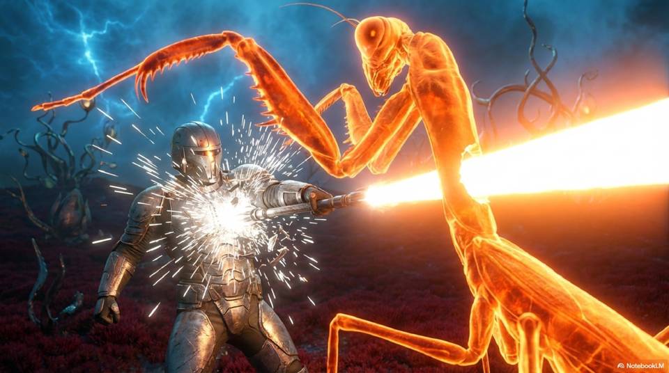 А потому рука сама подхватила посох яростного света, к которому меня так удачно отбросила тварь! Еще доли секунды мне потребовались чтобы навестись на силуэт «богомола», что уже рванул в мою сторону, занося свои лапы, а потом палец вдавился в светящиеся кружки, активируя выстрел.