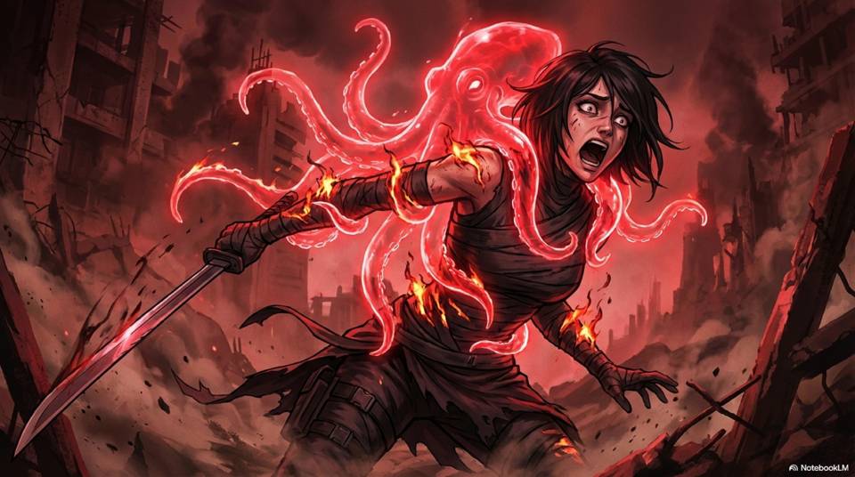 – А⁈ – В ответ мне просипели что-то нечленораздельное, а в глазах противницы, выглядывающих из-под плотной тканевой обмотки, скрывающей лицо, плескались ужас и боль. Кракен ее неслабо покоцал, оставляя энергетические ожоги от своих прикосновений. Одежда местами вообще превратилась в пепел, открывая множество участков оголенной кожи. Особенно в области спины, плеч и груди, так что последние сомнения в том, что это девушка, пропали.