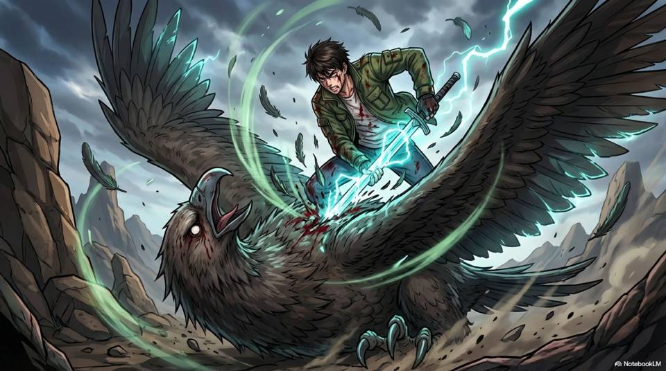 Удар! — Рубанул я, стараясь пройти насквозь покров, но снова потерпел неудачу и тогда перехватил меч обратным хватом, вонзая острие сверху в массивную спину птицы и наваливаясь всем весом.