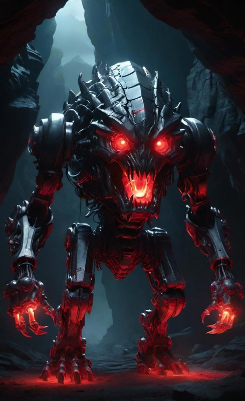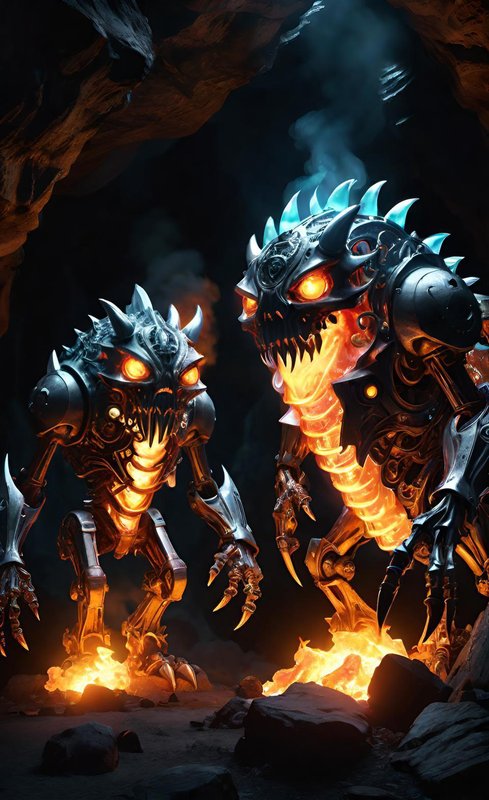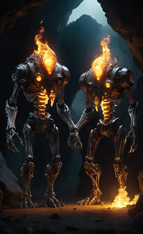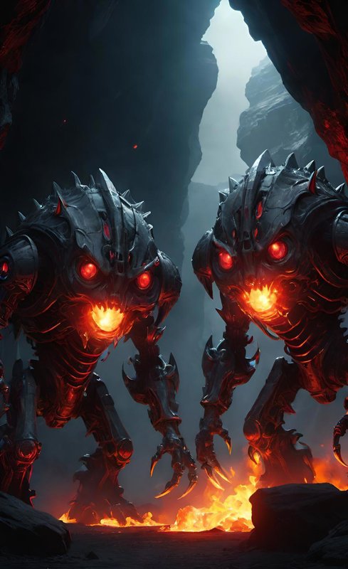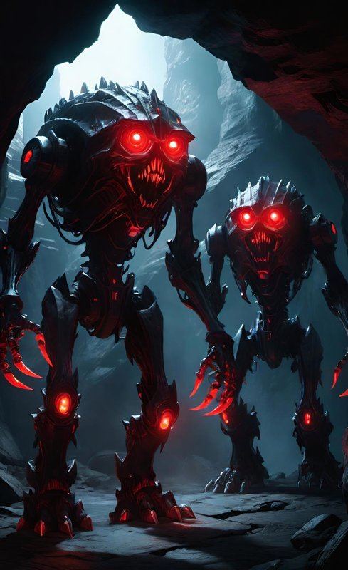 Ребята плелись по расширяющемуся проходу. Впереди наблюдалось неясное мерцание. Вскоре из сумрака на них уставились две пары алых огоньков. Они начали разгораться всё ярче. А в темноте стали вырисовываться очертания двух высоких чудищ. Две руки, две ноги, голова, но собраны словно из каменных глыб.