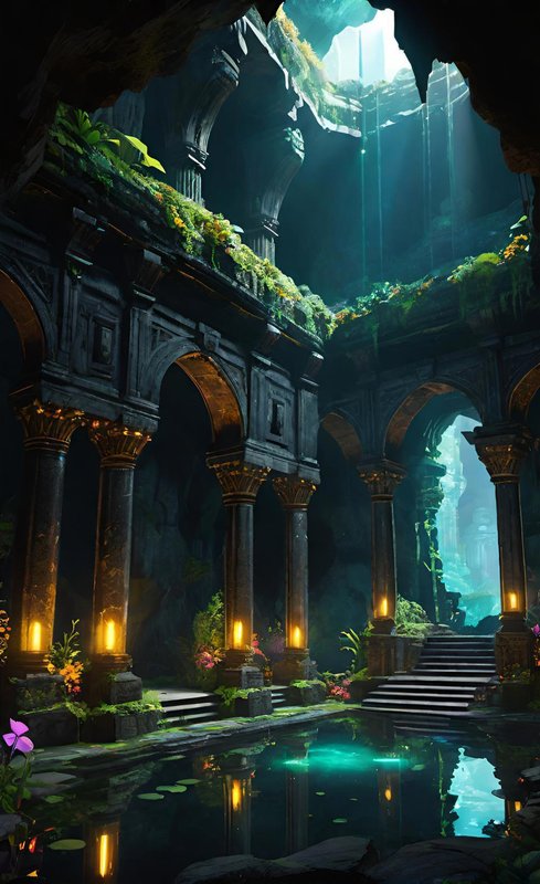 В центре зала, отражая разноцветные блики прозрачной поверхностью воды, располагался древний бассейн. Его окружали полированные камни с красивым узором. С разных сторон от него возвышались непонятные сооружения. Алтари или магическое оборудование? Предметы поклонения? Раньше ничего подобного на глаза не попадалось.