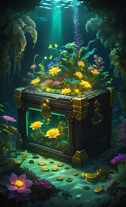 Раздвинув упругие растения, Алексей обнаружил лежащий на боку сундук. Вокруг приоткрытой крышки по обросшему дну рассыпаны блестящие вещицы. Пионер нащупал среди водорослей золотые монеты, кольца, какие-то цепочки и прочую мелочь. Дальше в замутнённой от активных действий воде было сложно что-то разглядеть.