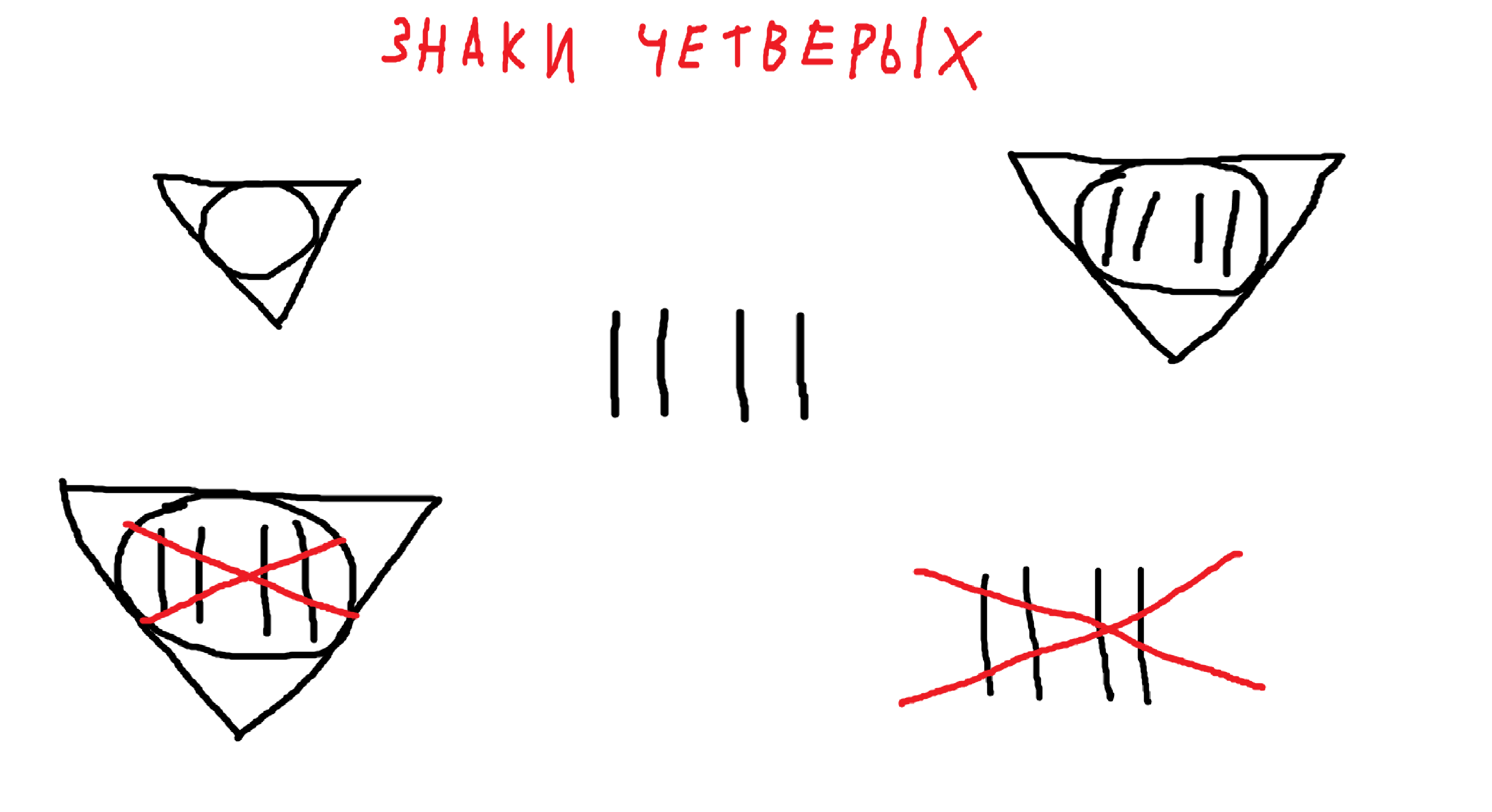 Дальше следуют четыре вертикальных полоски – своеобразное граффити или черепа на кольях, буквально крупный шрифт, оглашающий, что здесь уже начинается территория, подконтрольная чувачкам, топящим за Владык Полигона. Если же эти полоски перечеркнуты косым крестом – то это пиздец. Буквально, та самая рыбина, завернутая в пальто, по понятиям сицилийской мафии. Знак кровной мести и кровавого хаоса. Это рисуют на стенах, когда близится час расправы или вырезается на трупах. Тот кто начертал этот знак вряд ли просто так успокоится, и даже смерть станет не финалом этой истории, а новым этапом. Знаки часто тасовались друг с другом, но смысл плюс-минус оставался прежним. Были ли еще какие-нибудь или нет, мне не сообщили – еще не дорос.