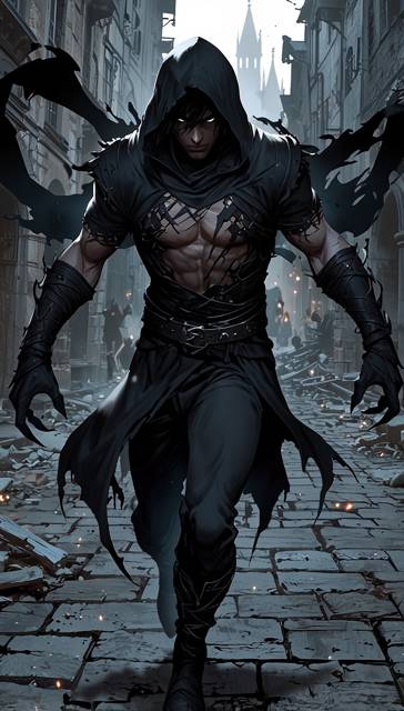 Энис всё ещё стоял на коленях, держа голову Элеаноры. Кольцо Тьмы на его пальце сияло, наполняя мир вокруг чернотой, словно всё окружающие моментально оказались в космосе. Рядом с парнем кружили всполохи магии, периодически мерцая, словно вспышки разорвавшихся молний. Плут резко поднял голову вверх и издал пронзительный крик. Демоны и Грезильда увидели, что от человека исходит чёрное сияние, словно он покрыт тёмным огнём. Белки его глаз стали чернее ночи. Он повернул голову в сторону Грезильды. Она поймала его взгляд и впервые за свою долгую жизнь испытала сковывающий ужас. Вспышка – и плут исчез. Вспышка – он стоит посреди поля битвы, демоны продолжают терзать его друзей. Волосы Эниса стали темнее и поднялись к вверху, одежда полностью почернела, а плащ за спиной превратился в живую тень. Со стороны казалось, что тьма вокруг него пожирает свет, тянет свои щупальца ко всему живому.