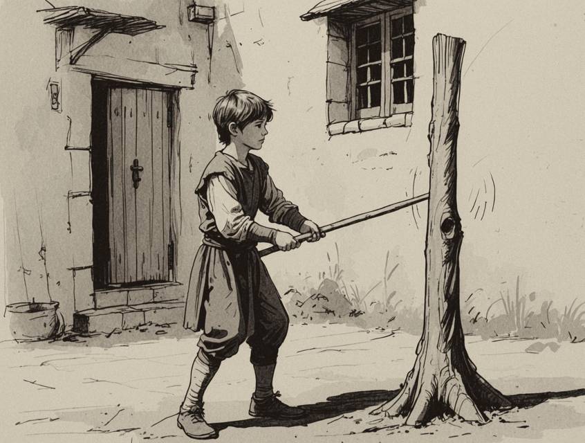Домашние дела, которые он завершил к обеду, отняли у него больше сил, чем он ожидал. Но мысль о тренировке не давала ему покоя. Ему нужна была идеальная палка – крепкая, ровная, достаточно длинная, чтобы имитировать меч, и удобная для хвата. Что-то, что могло бы стать продолжением его руки.