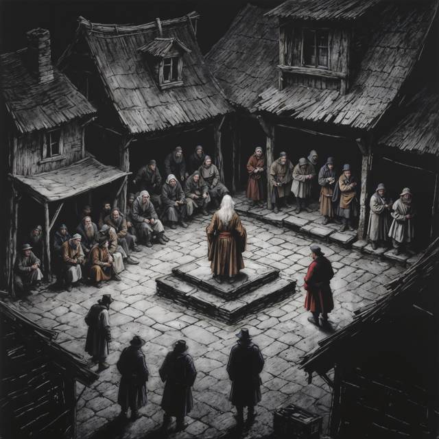 В центре площади стоял старый, покосившийся стол, перед которым собрались жители. Их лица были напряжены, а глаза бегали от одного к другому, словно каждый человек искал поддержки, но не находил. Ветер, холодный и порывистый, гонял по земле клочья пыли и сухие листья, создавая ощущение, что сама природа готовилась к этому собранию.