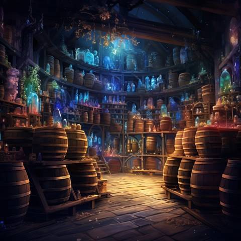 Здесь, в отличие от предыдущего хранилища, ресурсы лежали даже не в мешках и шкатулках, а прямо в бочках. Небольшое, по сути, помещение, оказалось забито битком. Полки ломились от веками собираемых редкостей; что-то, чему не нашлось упаковки, валялось прямо так, а то и свисало с потолка, распространяя вокруг себя чарующую магическую ауру.