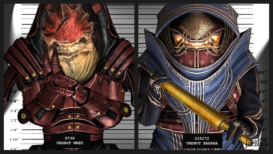 Вперед вышел кроган в ярко-алой броне, разрисованной черепами. Единственный без шлема, открывая свою шрамированную морду. В отличие от Драка, который использует полноценные кости, у этого на броне только рисунки. В остальном типовая броня, как у остальных. Остальные цели расположились полукругом. Вражеский командир заговорил: