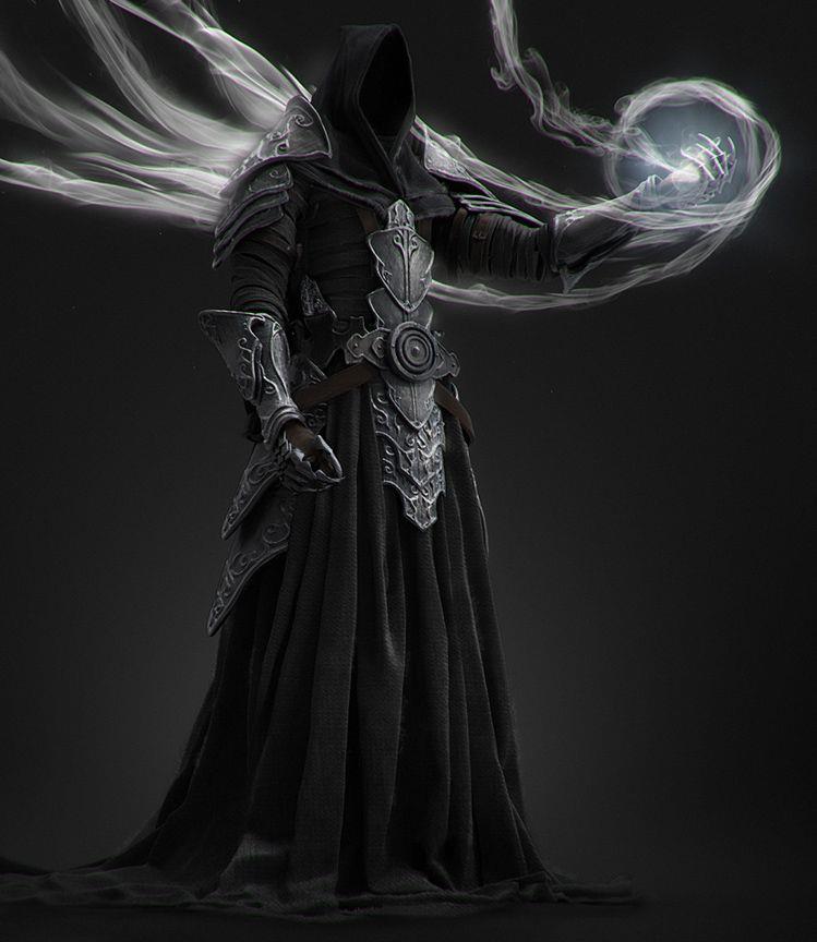 Следом мучительно медленно поднялась гуманоидная фигура в черной робе. Яркими пятнами на ней выделялись, бросаясь в глаза, элементы доспеха из серого металла: массивные наручи и покатые сегментированные наплечники. На их поверхности, в свою очередь, поблескивали, отражая свет, инкрустированные камни – искусно ограненные рубины и крупные темно-фиолетовые кристаллы правильной ромбовидной формы.
